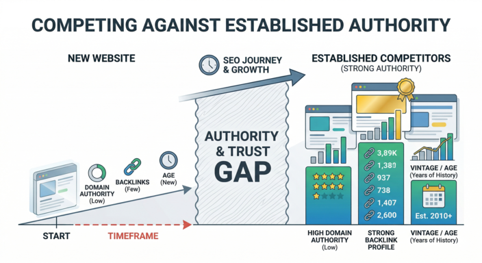 Three factors determine how hard a market actually is to rank in: the domain authority of top-ranking pages, the volume and quality of backlinks those pages have earned, and how long those pages have been established. The wider the gap on all three, the longer the timeline.