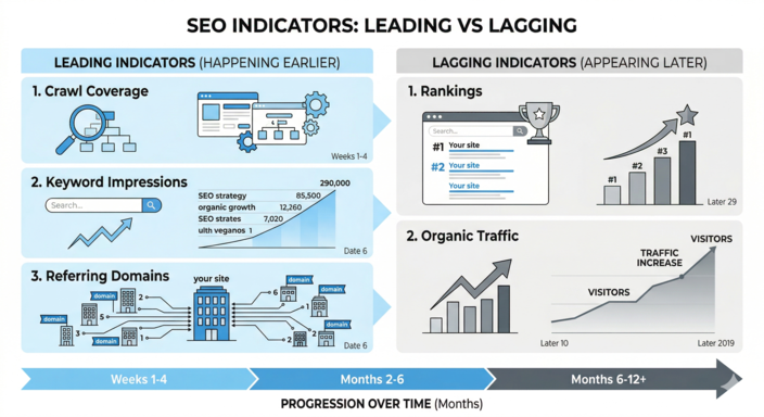 The leading indicators worth watching monthly are crawl coverage, keyword impressions in Google Search Console, and referring domain growth. If all three are trending upward over a 90-day window, rankings and traffic will follow. If they are flat or declining, the strategy needs to be examined before more time passes.